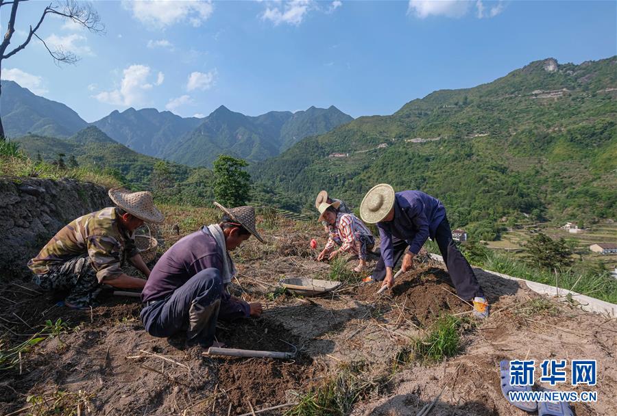 5月12日,青田縣巨浦鄉(xiāng)西坑村的村民在梯田收獲中藥貝母。當(dāng)?shù)夭扇『献魃缂懈N,冬春種中藥、夏秋種養(yǎng)水稻和田魚(yú)的方式,全面提升土地利用率和收益。新華社記者徐昱攝