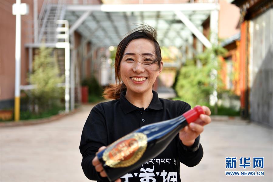 西藏芒康縣藏東珍寶酒業(yè)有限公司副總經理曲措在展示一款“達美擁”葡萄酒(5月4日攝)。新華社記者詹彥攝
