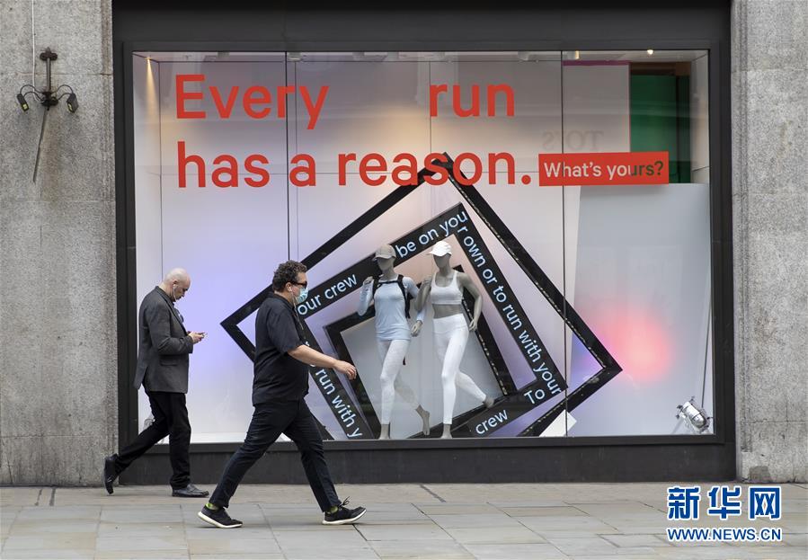 5月12日,人們從英國倫敦?cái)z政街關(guān)閉的店鋪前經(jīng)過。新華社記者韓巖攝