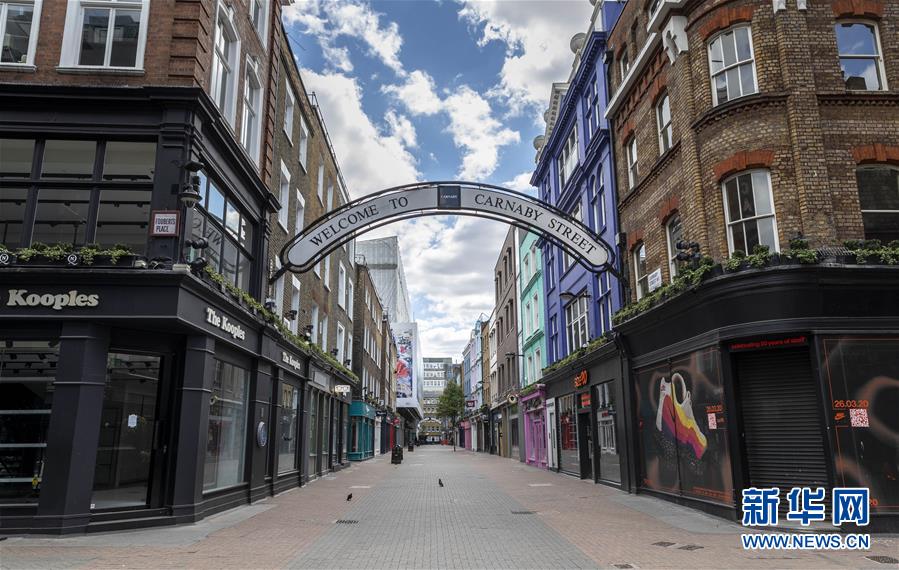 5月12日,英國倫敦主要商業(yè)街之一的卡納比街上的店鋪全部關(guān)閉。新華社記者韓巖攝