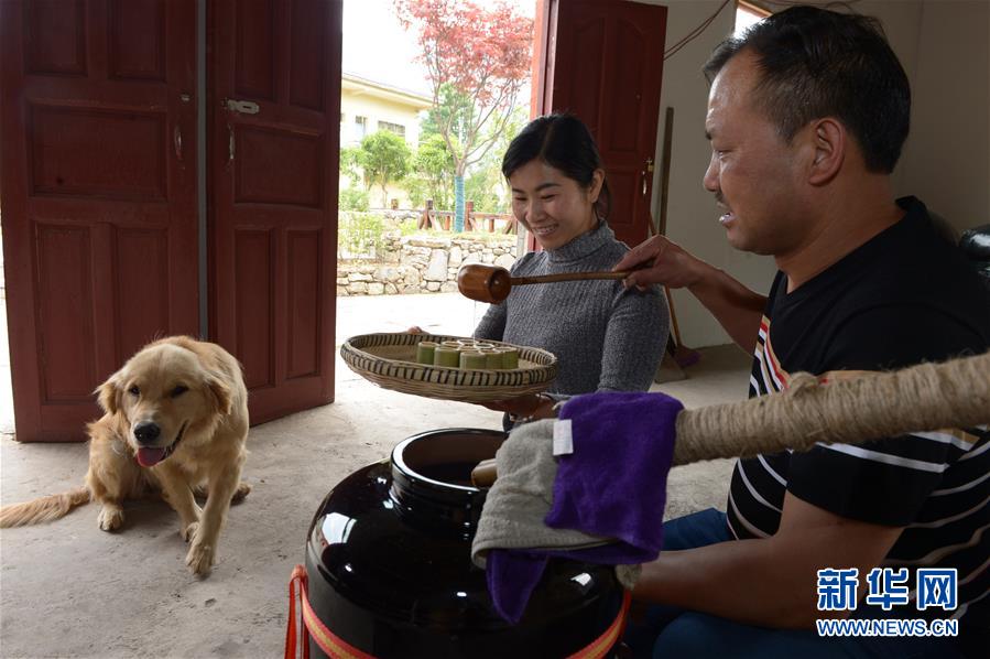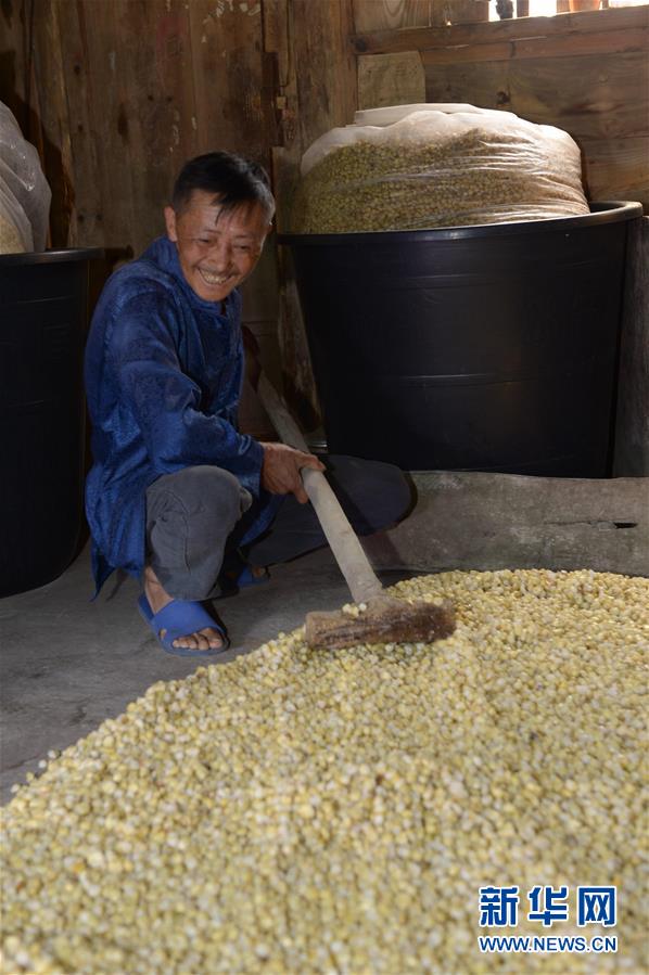 5月14日,在貴州省畢節(jié)市百里杜鵑管理區(qū)黃泥鄉(xiāng)龍?zhí)链逡患揖谱鞣唬迕駥τ衩走M行發(fā)酵。貴州省畢節(jié)市百里杜鵑管理區(qū)黃泥鄉(xiāng)龍?zhí)链宓凝執(zhí)凉啪疲颡毺氐墓欧ㄡ劸萍夹g,口感獨特而遠近聞名。全村有釀酒戶142戶,年產量達45萬多公斤,龍?zhí)凉啪七h銷重慶、廣東、浙江等地,龍?zhí)凉啪埔殉蔀辇執(zhí)寥嗽鍪盏闹匾獊碓?。新華社記者楊楹攝