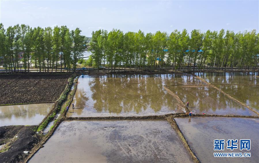 5月17日,在吉林省長春市雙陽區(qū)徐家村,農(nóng)民在水稻田間耕作(無人機(jī)照片)。新華社記者許暢攝