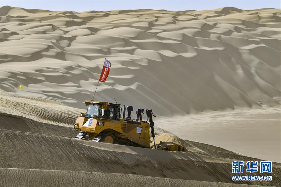 在新疆尉犁至且末沙漠公路施工現(xiàn)場(chǎng),工人駕駛大型推土機(jī)推平沙山(5月17日攝)。新華社記者胡虎虎攝