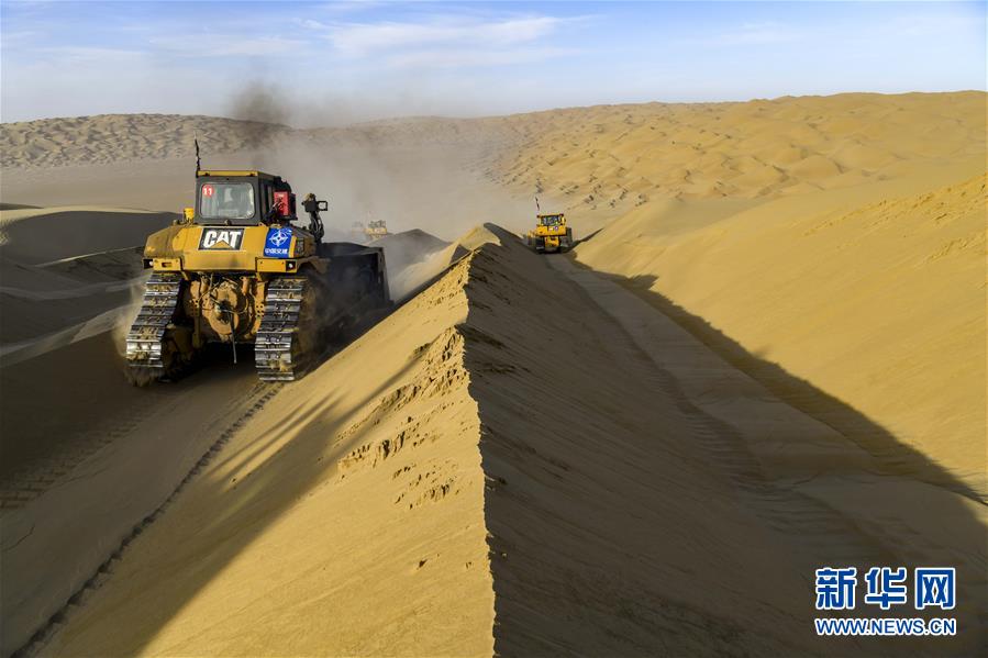 在新疆尉犁至且末沙漠公路施工現(xiàn)場,工人駕駛大型推土機(jī)推平沙山(5月16日攝)。新華社記者胡虎虎攝