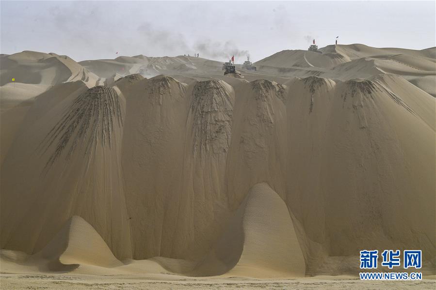 在新疆尉犁至且末沙漠公路施工現(xiàn)場,工人駕駛大型推土機(jī)推平沙山(5月17日攝)。新華社記者胡虎虎攝