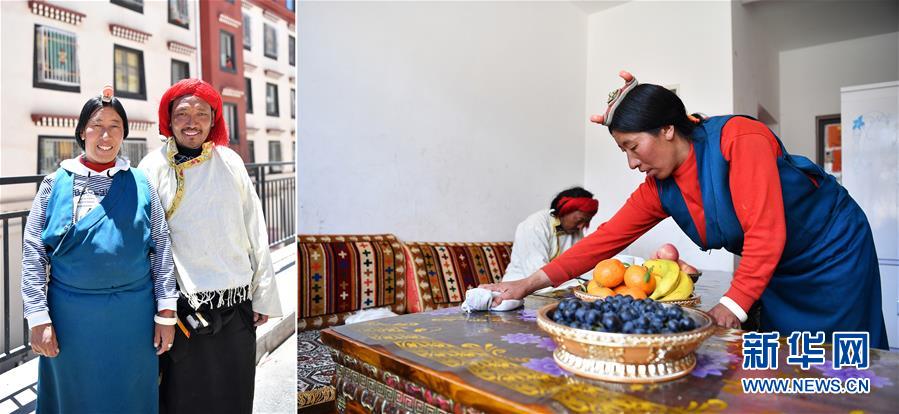 拼版照片:左圖為西藏昌都市八宿縣擁巴鄉(xiāng)娜帕村村民布貢(右)和妻子益西瓊措在安置點(diǎn)樓前;右圖為在八宿縣乃然易地扶貧搬遷安置點(diǎn),益西瓊措在家里打掃衛(wèi)生。2018年,布貢一家人搬遷到乃然易地扶貧搬遷安置點(diǎn),住進(jìn)了三室一廳的新居。和布貢一家一樣,八宿縣擁巴鄉(xiāng)、夏里鄉(xiāng)、瓦鄉(xiāng)的2000余名群眾完成易地搬遷,開啟美好的新生活(5月10日攝)。新華社記者詹彥攝