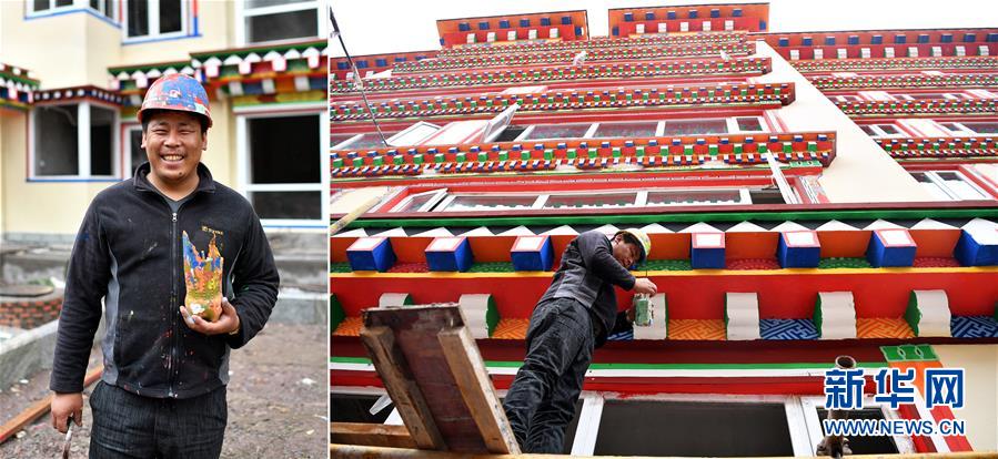 拼版照片:左圖為西藏昌都市卡若區(qū)卡若鎮(zhèn)卡若村村民洛松郎直;右圖為洛松郎直在昌都市一處建筑工地進(jìn)行外墻彩繪作業(yè)。洛松郎直從小就喜歡畫畫,由于家境貧寒,初中畢業(yè)后,他回到家里干農(nóng)活、放牧,挑起家庭重?fù)?dān),但一直沒有放棄畫畫的夢想。后來,洛松郎直前往卡若區(qū)拉多鄉(xiāng)學(xué)習(xí)唐卡繪畫,技藝得到很大提高。2017年,洛松郎直為卡若區(qū)一個周轉(zhuǎn)房建設(shè)項(xiàng)目繪制墻體彩繪。2018年,在村里的支持下,洛松郎直創(chuàng)辦了公司,承攬更多的藏式墻體彩繪工程(4月30日攝)。新華社記者詹彥攝