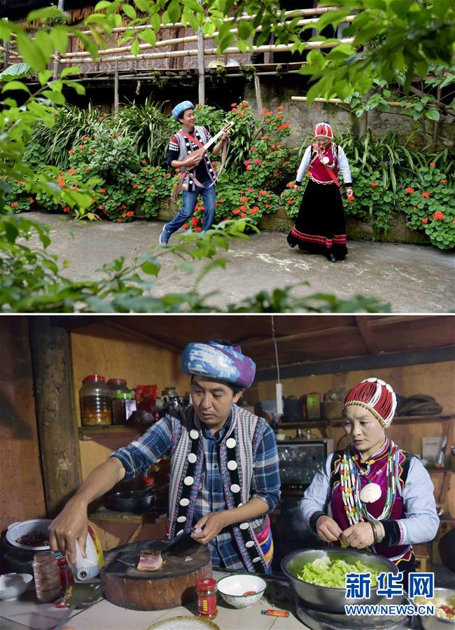 拼版照片上圖:郁伍林和魯冰花在客棧院子里彈唱歌舞(2017年5月27日攝);下圖:郁伍林和魯冰花為客人準(zhǔn)備晚餐(2017年5月26日攝)。云南省怒江傈僳族自治州福貢縣匹河怒族鄉(xiāng)老姆登村的郁伍林和妻子魯冰花,是該村開辦農(nóng)家樂和客棧的致富帶頭人。夫妻倆還創(chuàng)建了茶葉品牌,幫助老姆登村怒族群眾把種植的生態(tài)茶葉銷往國內(nèi)外。在他們的引導(dǎo)和帶動(dòng)下,山寨的父老鄉(xiāng)親通過經(jīng)營農(nóng)家樂客棧和種植茶葉逐步脫貧致富,日子越過越紅火。黨的十八大以來,我們堅(jiān)持以人民為中心的發(fā)展思想,明確了到2020年我國現(xiàn)行標(biāo)準(zhǔn)下農(nóng)村貧困人口實(shí)現(xiàn)脫貧、貧困縣全部摘帽、解決區(qū)域性整體貧困的目標(biāo)任務(wù)。目前看,脫貧進(jìn)度符合預(yù)期,成就舉世矚目。這些成績的取得,凝聚了全黨全國各族人民智慧和心血,是廣大干部群眾扎扎實(shí)實(shí)干出來的。脫貧摘帽不是終點(diǎn),而是新生活、新奮斗的起點(diǎn)。新華社記者楊宗友攝