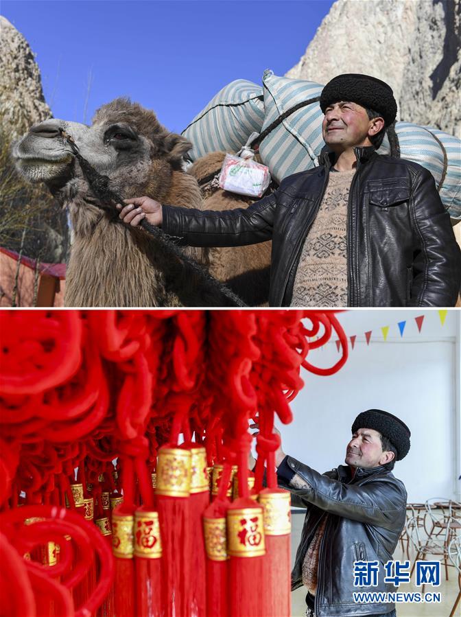 拼版照片上圖:都熱·加爾曼牽著馱有搬遷行李的駱駝走在喀喇昆侖山中(2018年11月17日攝);在塔什庫爾干塔吉克自治縣塔提庫力易地扶貧搬遷安置點(diǎn)的衛(wèi)星工廠,都熱·加爾曼在參觀由村民編制的手工藝品,他計(jì)劃讓妻子來這里上班(2018年11月18日攝)。2018年以來,新疆塔什庫爾干塔吉克自治縣對(duì)居住在艱苦偏遠(yuǎn)山區(qū)、生產(chǎn)生活資料匱乏、難以實(shí)現(xiàn)就地脫貧的358戶貧困戶,陸續(xù)實(shí)施易地扶貧搬遷,搬遷至距縣城約25公里的塔提庫力易地扶貧搬遷安置點(diǎn)。安置點(diǎn)還開發(fā)了耕地、草場,建有衛(wèi)星工廠,確保像都熱一樣的貧困戶能穩(wěn)步增收脫貧。黨的十八大以來,我們堅(jiān)持以人民為中心的發(fā)展思想,明確了到2020年我國現(xiàn)行標(biāo)準(zhǔn)下農(nóng)村貧困人口實(shí)現(xiàn)脫貧、貧困縣全部摘帽、解決區(qū)域性整體貧困的目標(biāo)任務(wù)。目前看,脫貧進(jìn)度符合預(yù)期,成就舉世矚目。這些成績的取得,凝聚了全黨全國各族人民智慧和心血,是廣大干部群眾扎扎實(shí)實(shí)干出來的。脫貧摘帽不是終點(diǎn),而是新生活、新奮斗的起點(diǎn)。新華社記者胡虎虎攝