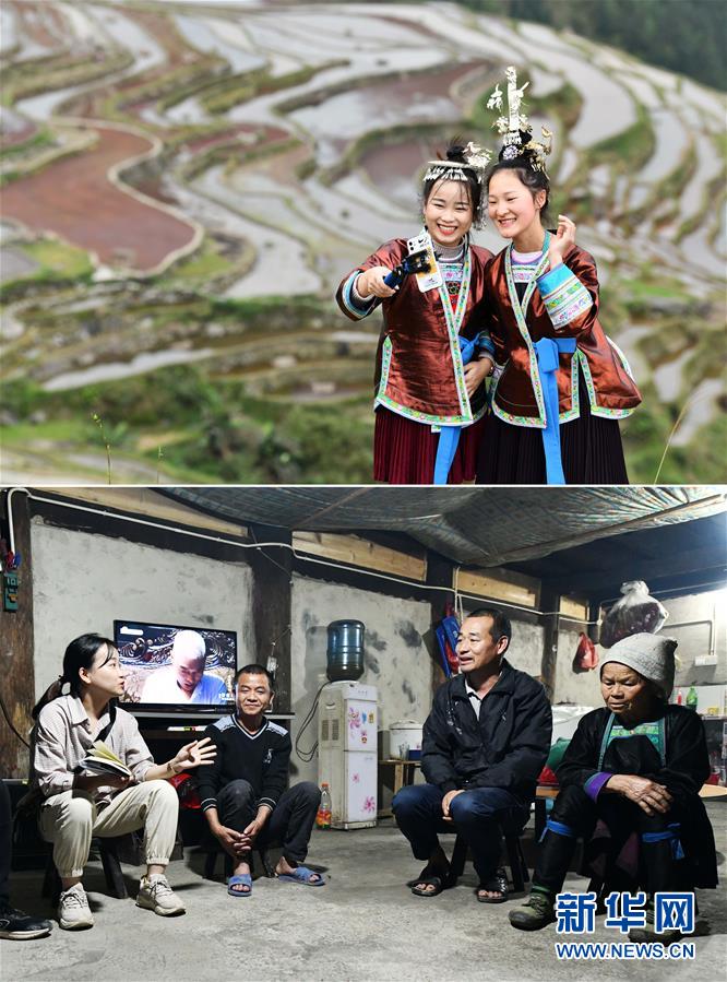 拼版照片上圖:吳賢艷(左)與村里的大一女生梁瓊英在直播推介加榜梯田風(fēng)光(4月19日攝);下圖:吳賢艷(左一)夜訪貧困戶(4月18日攝)。從江縣是貴州省深度貧困縣之一。1994年出生的從江縣侗族女孩吳賢艷在2017年大學(xué)畢業(yè)后回到月亮山區(qū)。2019年3月,她成為從江縣加榜鄉(xiāng)加車村脫貧攻堅(jiān)指揮所的一名網(wǎng)格員。吳賢艷和其他駐村干部不僅會(huì)主動(dòng)幫助缺少勞動(dòng)力的農(nóng)戶,還利用閑暇時(shí)間通過網(wǎng)絡(luò)平臺(tái),向山外推介美麗的加榜梯田和苗寨風(fēng)光,吸引更多的游客來旅游,為村民們脫貧增收出謀劃策。黨的十八大以來,我們堅(jiān)持以人民為中心的發(fā)展思想,明確了到2020年我國現(xiàn)行標(biāo)準(zhǔn)下農(nóng)村貧困人口實(shí)現(xiàn)脫貧、貧困縣全部摘帽、解決區(qū)域性整體貧困的目標(biāo)任務(wù)。目前看,脫貧進(jìn)度符合預(yù)期,成就舉世矚目。這些成績的取得,凝聚了全黨全國各族人民智慧和心血,是廣大干部群眾扎扎實(shí)實(shí)干出來的。脫貧摘帽不是終點(diǎn),而是新生活、新奮斗的起點(diǎn)。新華社記者楊文斌攝