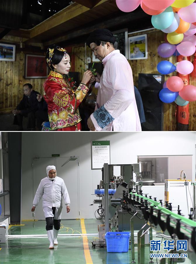 拼版照片上圖:婚禮開始前,吳春霞(左)為施六金佩戴胸花(2018年9月24日攝);下圖:施六金在十八洞村新建的山泉水廠里工作(2018年2月3日攝)。地處武陵山腹地的湖南湘西土家族苗族自治州花垣縣十八洞村曾深陷貧困。2013年,村里225戶中有136戶是貧困戶,40歲以上的“光棍兒”有30多人。2014年以來,十八洞村逐漸蛻變。2016年初,結(jié)束外出打工的施六金返鄉(xiāng)辦起“苗家樂”。2017年,村里的十八洞村山泉水廠正式建成投產(chǎn),他受聘成為廠里的技術(shù)工人,每月都有固定工資。隨著日子越過越好,許多像施六金這樣摘了窮帽的大齡“光棍兒”收獲了愛情,實(shí)現(xiàn)了安居樂業(yè),事業(yè)愛情雙豐收。黨的十八大以來,我們堅(jiān)持以人民為中心的發(fā)展思想,明確了到2020年我國現(xiàn)行標(biāo)準(zhǔn)下農(nóng)村貧困人口實(shí)現(xiàn)脫貧、貧困縣全部摘帽、解決區(qū)域性整體貧困的目標(biāo)任務(wù)。目前看,脫貧進(jìn)度符合預(yù)期,成就舉世矚目。這些成績的取得,凝聚了全黨全國各族人民智慧和心血,是廣大干部群眾扎扎實(shí)實(shí)干出來的。脫貧摘帽不是終點(diǎn),而是新生活、新奮斗的起點(diǎn)。新華社記者李尕?cái)z