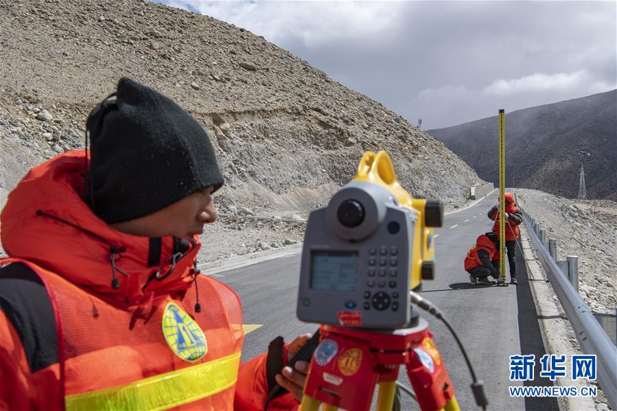 國測一大隊隊員在日喀則市定日縣曲當鄉(xiāng)境內進行水準測量(4月18日攝)。新華社記者孫非攝