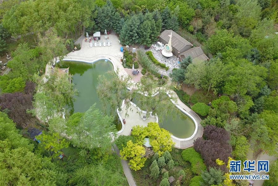 這是5月18日在蘭州市城關(guān)區(qū)拍攝的皋蘭山下五泉山公園初夏景象(無人機照片)。