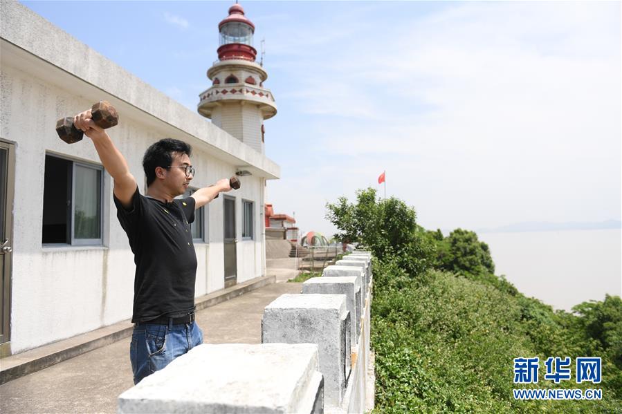 5月20日,在寧波七里嶼,葉家第五代燈塔工葉超群在工作間隙健身。葉超群自2013年起在七里嶼燈塔工作。新華社記者翁忻旸攝