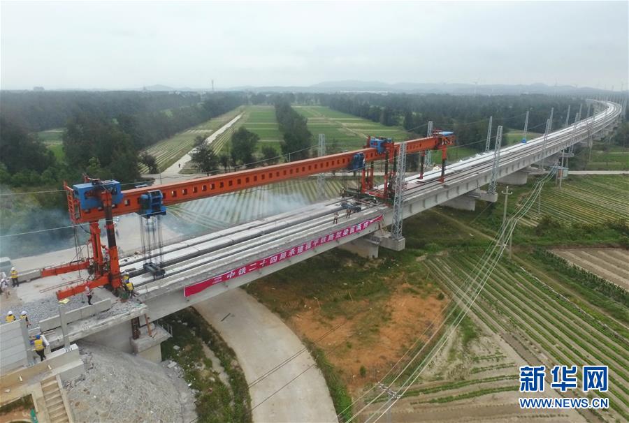 5月20日,福平鐵路洋中特大橋最后一片T型梁成功架設(shè)(無人機(jī)照片)。新華社記者林善傳攝