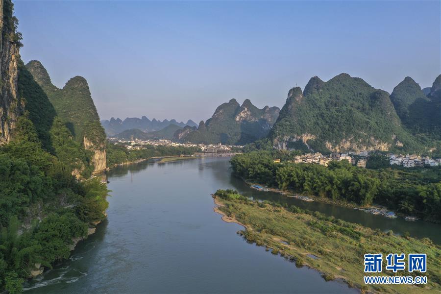 這是在廣西桂林市陽朔縣興坪鎮(zhèn)拍攝的山水風光(5月21日攝,無人機全景照片)?!吧n蒼森八桂,茲地在湘南。江作青羅帶,山如碧玉篸……”一千多年前,唐朝詩人韓愈寫盡桂林山水之美。初夏時節(jié),在廣西桂林市陽朔縣興坪鎮(zhèn),藍天白云下,煙雨朦朧中,桂林山水盡顯秀美。新華社記者周華攝