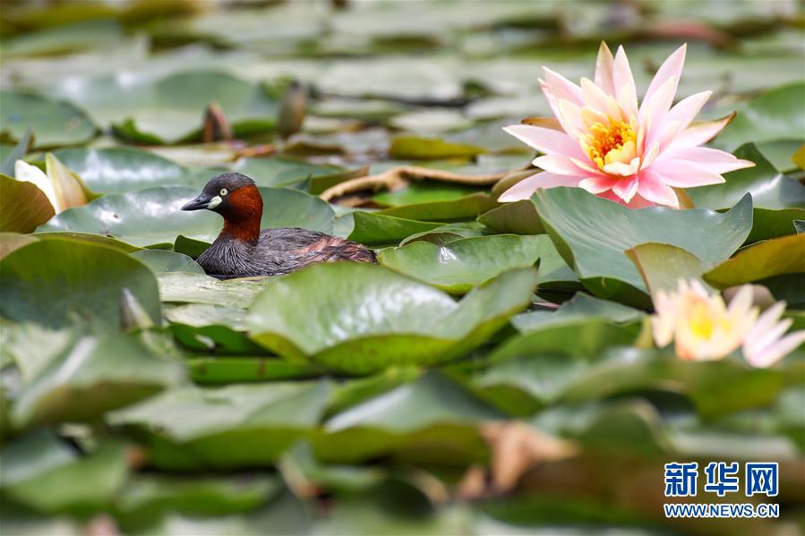 5月22日,一只在蓮葉間游弋。近日,貴陽(yáng)市觀山湖公園內(nèi)大片盛開的蓮花吸引了不少水鳥在其間嬉戲覓食。新華社記者劉續(xù)攝