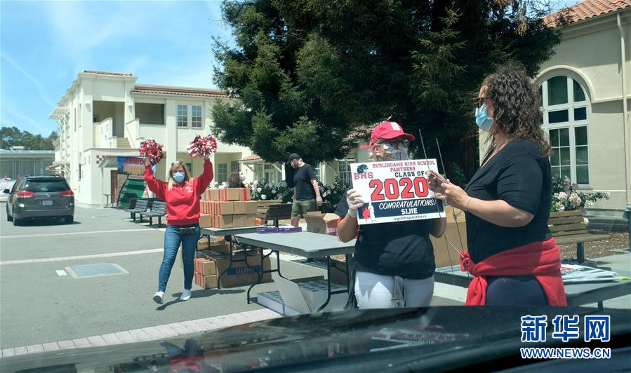 5月22日,在美國(guó)加州北部圣馬特奧縣,人們歡迎來(lái)辦理畢業(yè)手續(xù)的學(xué)生。新華社記者吳曉凌攝