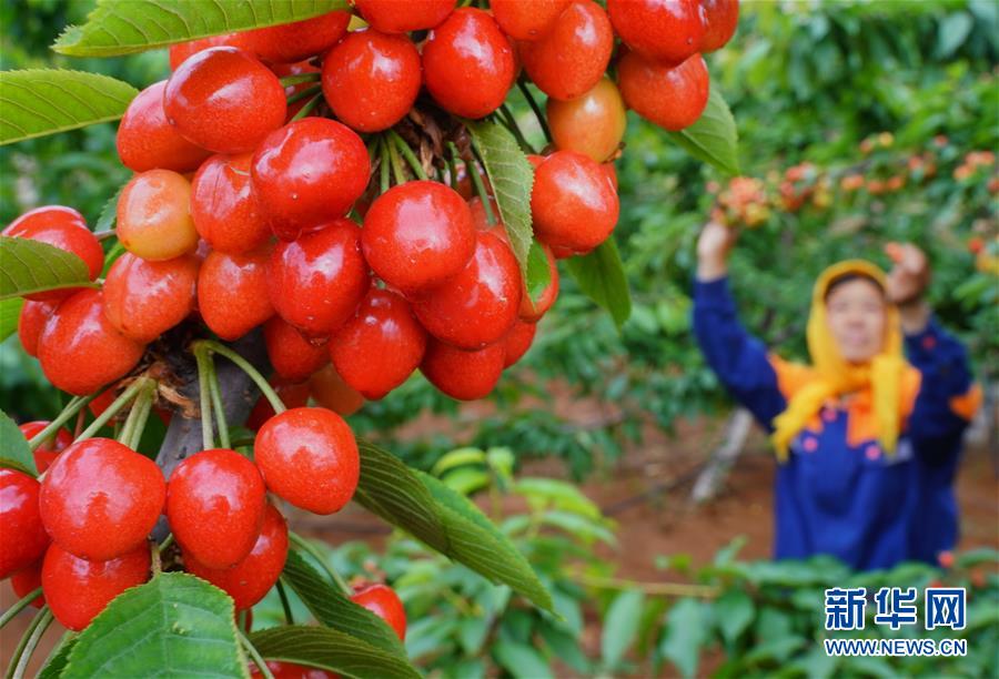 5月24日,灤州市九百戶鎮(zhèn)雞冠山生態(tài)產(chǎn)業(yè)園的工人在采摘大櫻桃。新華社記者楊世堯攝