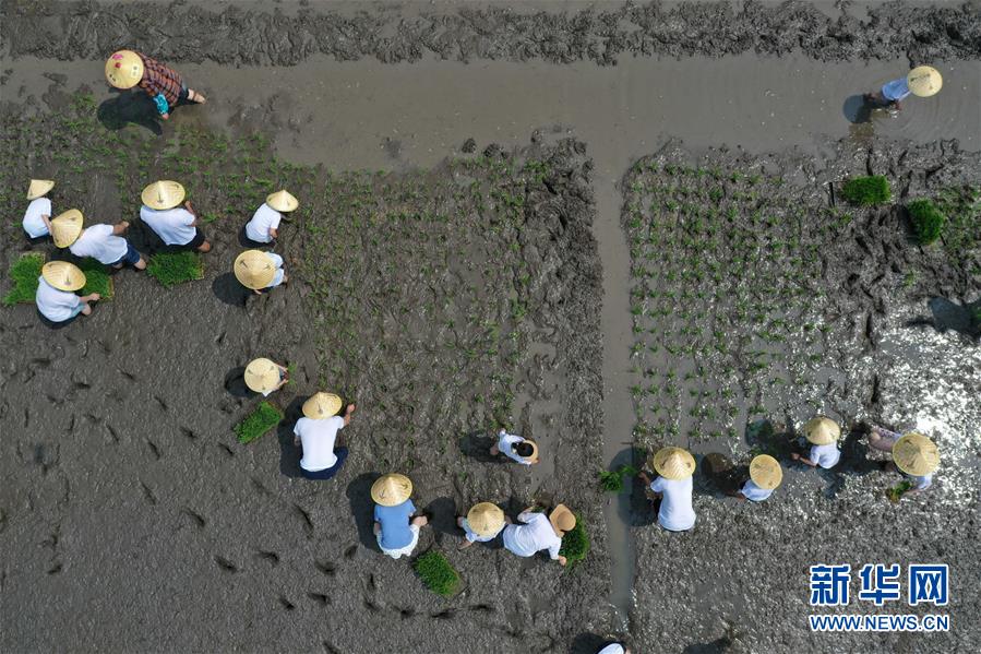 5月24日,小朋友與家長在稻田里參加親子插秧比賽(無人機照片)。當(dāng)日,十余名小朋友在家長的帶領(lǐng)下來到浙江省湖州市吳興區(qū)八里店鎮(zhèn)尹家圩糧油植保農(nóng)機專業(yè)合作社的稻田中,參加親子插秧、稻田捉魚等農(nóng)事體驗活動。新華社記者黃宗治攝