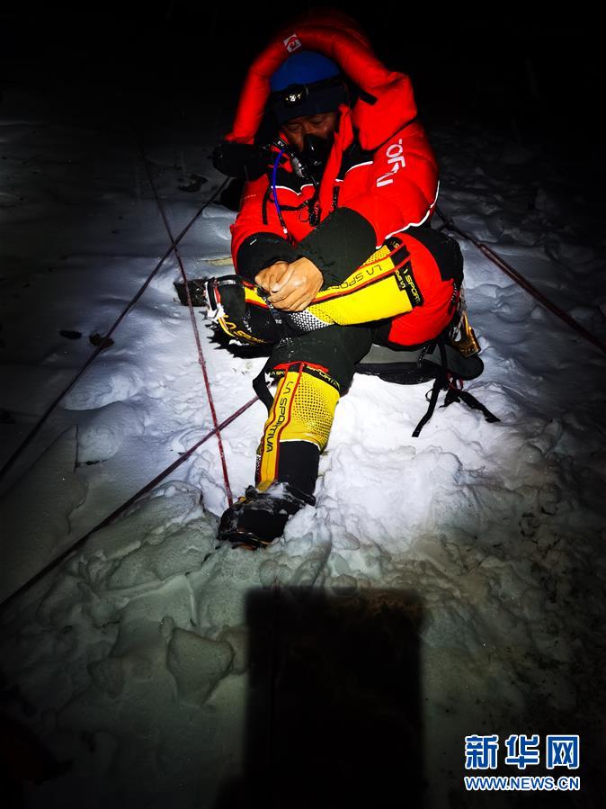 5月27日,2020珠峰高程測量登山隊(duì)隊(duì)員正在穿戴登山裝備。新華社特約記者扎西次仁攝