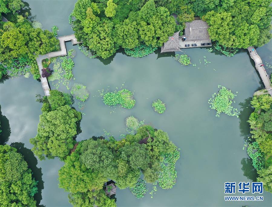 5月27日,游人在西湖曲院風(fēng)荷景區(qū)游覽(無人機(jī)照片)。隨著氣溫升高,杭州西湖綠意蔥蘢,展現(xiàn)出柔美的湖光山色。新華社記者翁忻旸攝