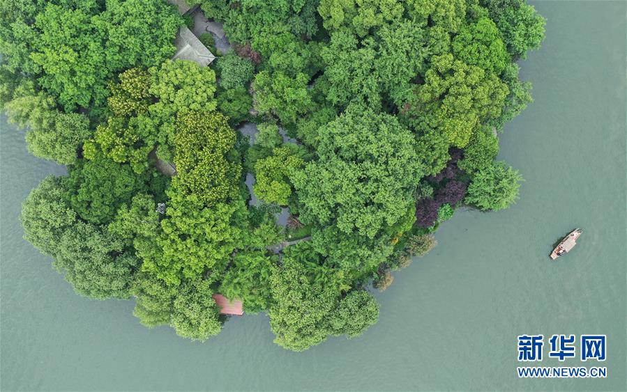 5月27日,船只在西湖湖心亭附近行駛(無人機(jī)照片)。隨著氣溫升高,杭州西湖綠意蔥蘢,展現(xiàn)出柔美的湖光山色。新華社記者翁忻旸攝
