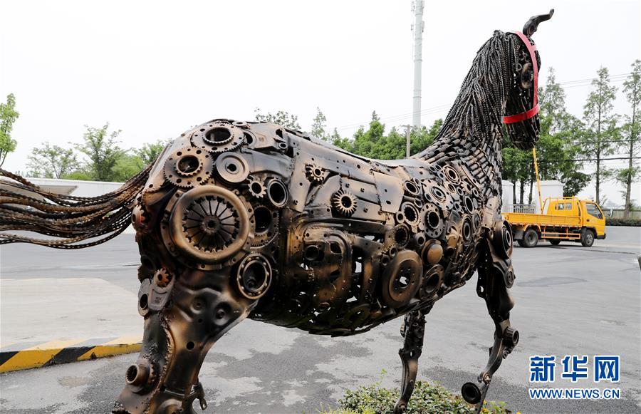 利用廢舊汽車零部件制作的馬造型工藝品擺在中轉服務站內(nèi)(5月27日攝)。新華社記者方喆攝