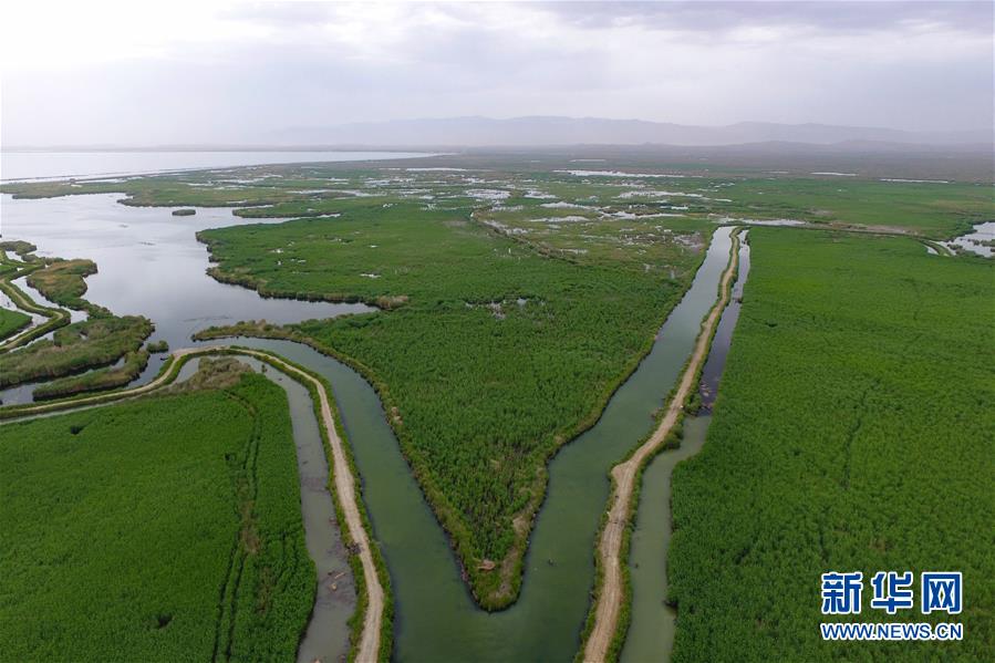 這是5月20日拍攝的新疆博湖縣博斯騰湖邊的蘆葦(無人機照片)。新華社記者宋彥樺攝