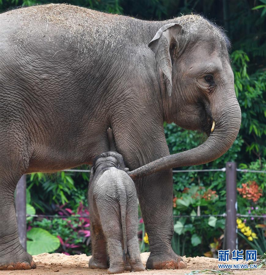 5月27日,廣州長隆的新生亞洲象寶寶在吃奶。在不到一個月的時間內,廣州長隆野生動物世界的亞洲象家族迎來兩名新丁。4月30日,亞洲象莉娜產下一頭公象,出生時體重88公斤;5月12日,亞洲象伊拉產下一頭母象,出生體重達108公斤。大象媽媽莉娜和伊拉均為長隆野生動物世界亞洲象種群繁育基地繁殖的亞洲象。至此,長隆亞洲象家族已繁衍至第三代,現(xiàn)共有27頭大象。新華社記者劉大偉攝