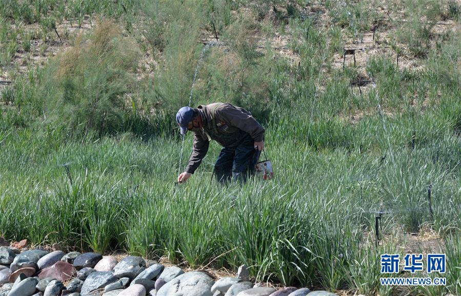 5月28日,工人在巴丹吉林鎮(zhèn)生態(tài)修復(fù)項目南部河道附近修理噴灌設(shè)備,以節(jié)約用水。2017年以來,內(nèi)蒙古阿拉善右旗在巴丹吉林鎮(zhèn)開展生態(tài)修復(fù)項目,種植適合在當?shù)厣L的馬蓮、紅柳等植物,修復(fù)生態(tài)的同時也起到美化作用。巴丹吉林鎮(zhèn)是巴丹吉林沙漠旅游景區(qū)的游客集散地,這里常年干旱少雨,水資源匱乏。新華社記者徐欽攝