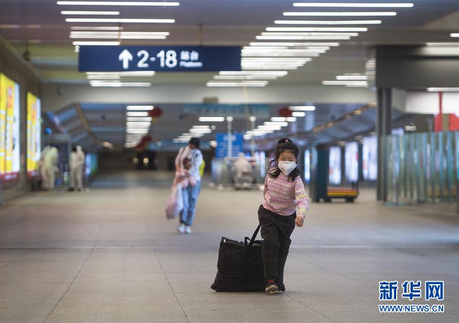 武漢恢復鐵路客站到達業(yè)務當天,在武漢漢口火車站,一名小女孩拉著行李走在家長的前面(3月28日攝)。新華社記者肖藝九攝