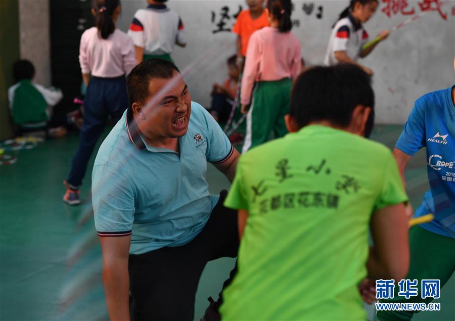 七星小學(xué)跳繩隊(duì)教練賴宣治(左)正大吼著激勵(lì)隊(duì)員訓(xùn)練。正是這位沒有接觸過專業(yè)跳繩訓(xùn)練的的體育老師把跳繩運(yùn)動(dòng)引入學(xué)校,十年不懈,領(lǐng)著孩子們從鄉(xiāng)村的小操場(chǎng)跳到世界的大舞臺(tái)(2019年11月18日攝)。新華社記者劉大偉攝