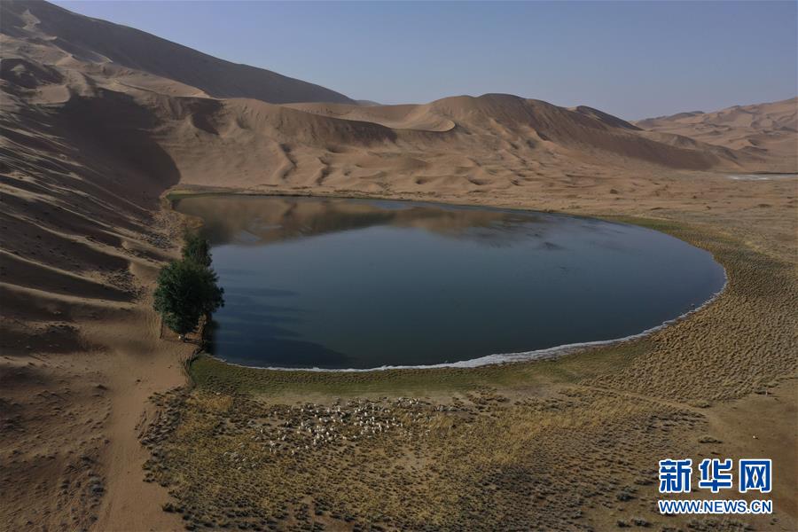 5月30日,羊群在巴丹吉林沙漠一處沙漠湖泊的湖畔休憩(無人機照片)。新華社記者徐欽攝。