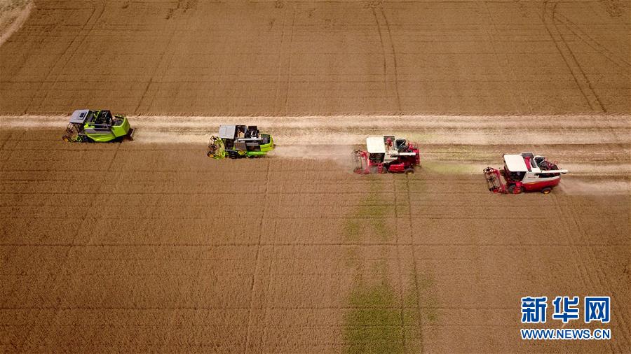 6月3日,收割機(jī)在汶上縣郭倉(cāng)鎮(zhèn)的麥田里收獲小麥(無(wú)人機(jī)航拍)。目前,我國(guó)第二大小麥主產(chǎn)區(qū)山東6000多萬(wàn)畝小麥進(jìn)入收獲階段。農(nóng)民們搶抓有利天氣,自南向北陸續(xù)開(kāi)鐮。新華社記者郭緒雷攝。