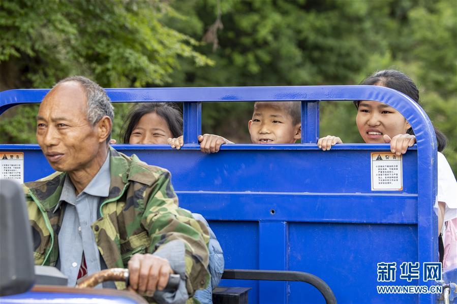 6月2日,秦春蘭、秦秋蘭和秦興旺姐弟三人乘坐父親駕駛的三輪車前往學(xué)校。新華社記者楊晨光攝。
