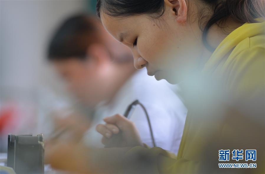 6月4日,一名女工在永州市新田縣一處易地搬遷集中安置點的扶貧車間里加工電器零部件。新華社記者趙眾志攝。