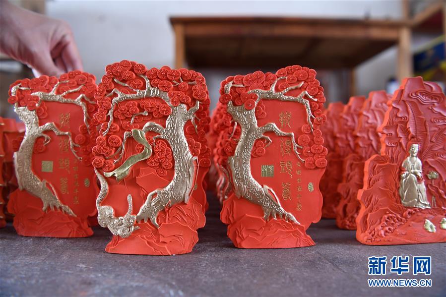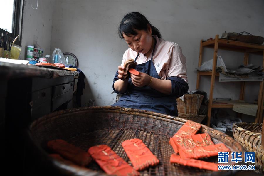 5月20日,安徽省非物質文化遺產徽墨代表性傳承人項德勝在雕刻墨模。新華社記者劉軍喜攝。