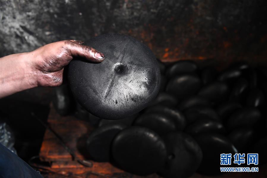 5月21日,安徽歙縣“項(xiàng)氏徽墨”的工人在查看墨餅。墨餅經(jīng)過加熱融化,再進(jìn)行捶打,制作成墨胚。新華社記者張端攝。