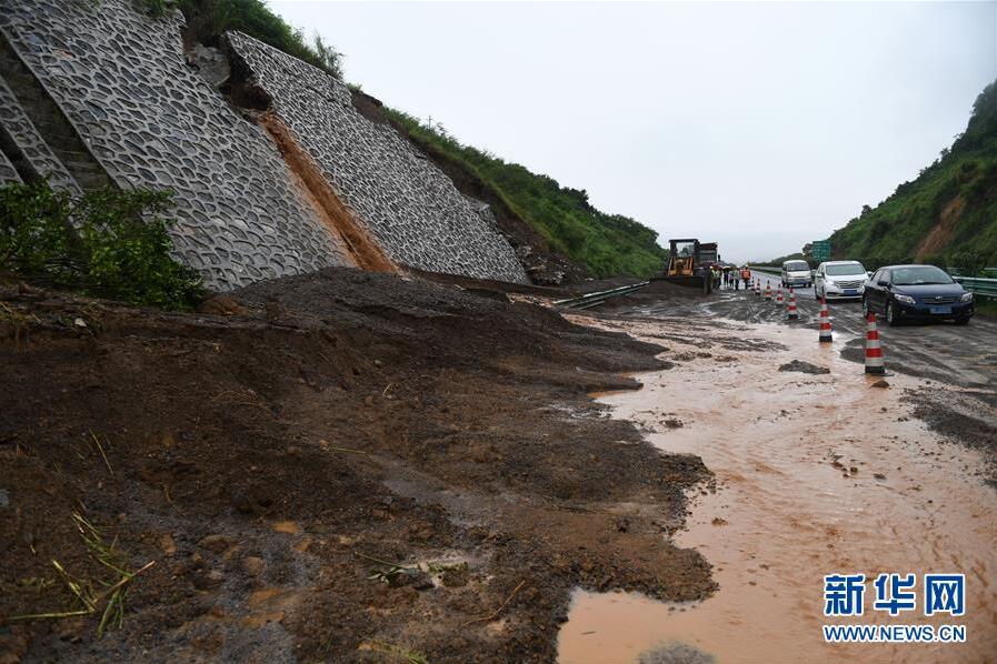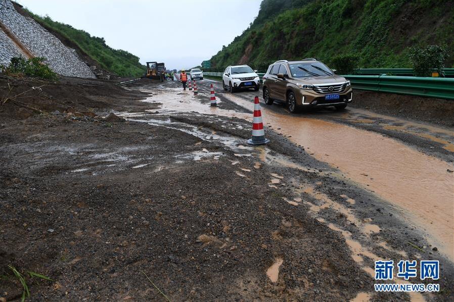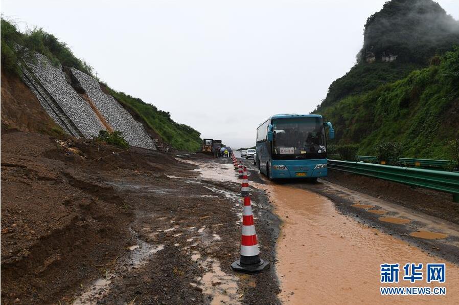 6月7日,在廣西鹿寨至陽(yáng)朔的高速公路上,車輛從一處發(fā)生滑坡的路段經(jīng)過(guò)。新華社記者陸波岸攝