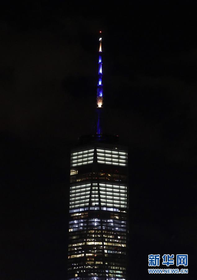 這是6月7日拍攝的點(diǎn)亮藍(lán)色和金色燈光的美國(guó)紐約世貿(mào)中心一號(hào)樓。新華社記者王迎攝