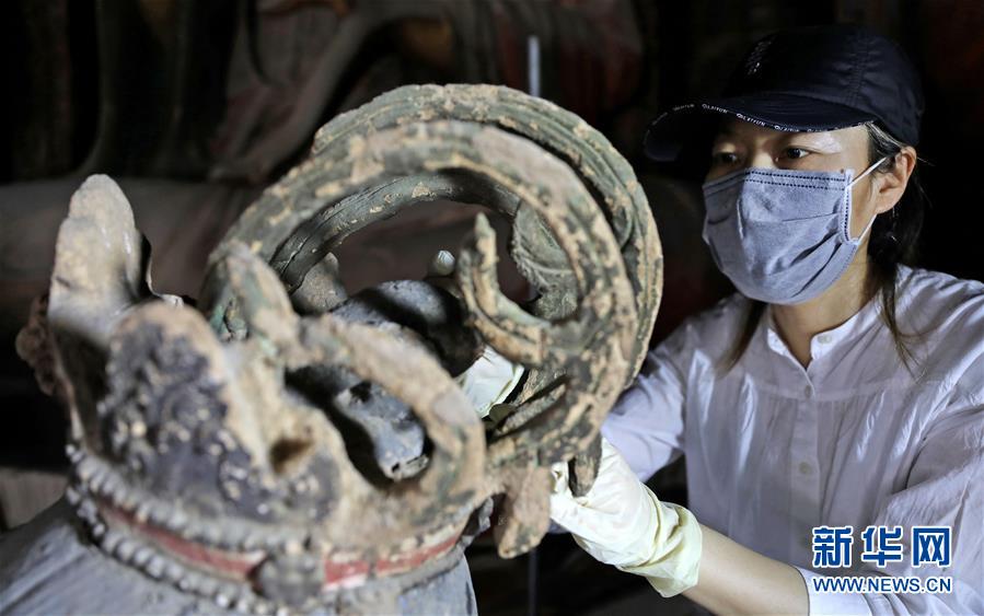 6月8日,工作人員對奉國寺的彩繪泥塑進行保護修復(fù)。新華社記者姚劍鋒攝