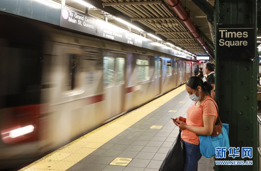 6月8日,佩戴口罩的乘客在美國紐約一地鐵站內(nèi)等車,地面上安置了保持社交距離的標記。在因新冠疫情進入“居家令”近三個月之后,美國紐約市于當?shù)貢r間8日開始“解封”,進入經(jīng)濟重啟的第一階段。新華社記者王迎攝