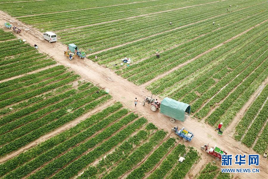 6月8日,粵港澳大灣區(qū)“菜籃子”(金昌)生產基地工作人員在采摘蔬菜(無人機照片)。盛夏漸近,位于甘肅省金昌市金川區(qū)的粵港澳大灣區(qū)“菜籃子”(金昌)生產基地的多種蔬菜陸續(xù)豐收。該基地種植面積達1.3萬多畝,采用高效噴灌、精量播種等技術,以及“企業(yè)+合作社+基地+農戶”的模式,通過輪作倒茬、循環(huán)供應的方式,每年可種植蔬菜3至4茬,畝均產量2000公斤左右,總產值達1.5億元。新華社記者范培珅攝