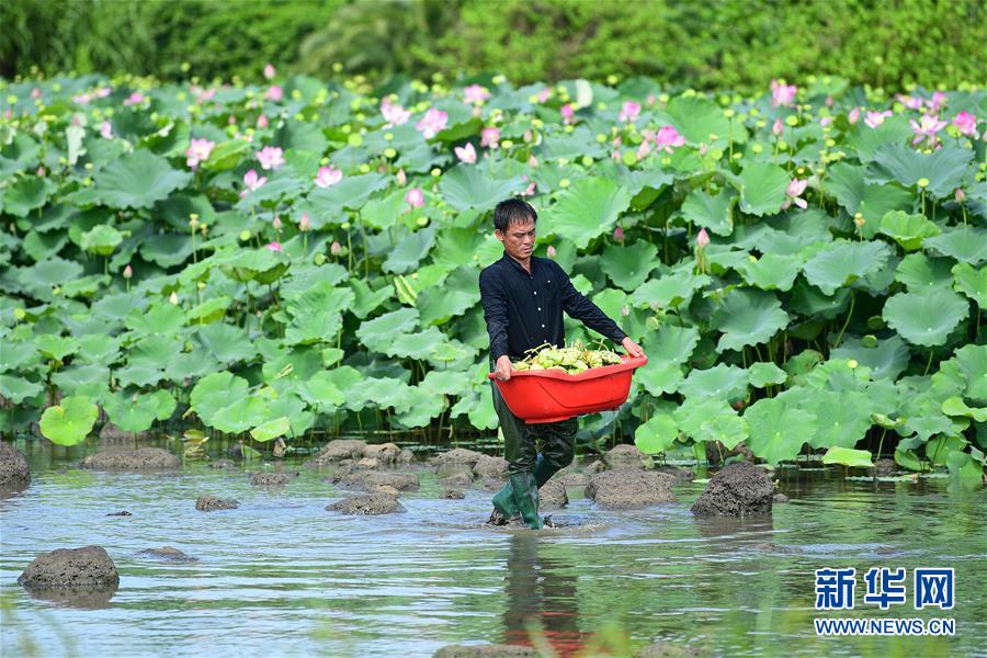 6月9日,村民在??邶埲A區(qū)龍泉鎮(zhèn)美仁坡村采摘蓮蓬。初夏時節(jié),位于海南海口龍華區(qū)龍泉鎮(zhèn)的蓮蓬逐漸成熟,當?shù)卮迕窦泳o采摘,一派繁忙景象。新華社記者蒲曉旭攝