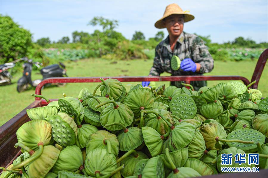 6月9日,村民在??邶埲A區(qū)龍泉鎮(zhèn)椰子頭村裝運采摘的蓮蓬。初夏時節(jié),位于海南??邶埲A區(qū)龍泉鎮(zhèn)的蓮蓬逐漸成熟,當?shù)卮迕窦泳o采摘,一派繁忙景象。新華社記者蒲曉旭攝