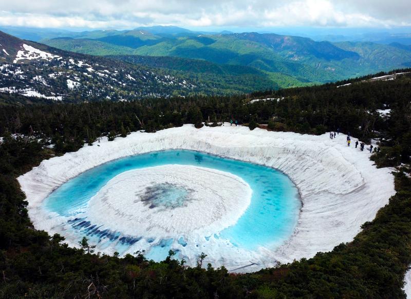 當(dāng)?shù)貢r(shí)間2020年6月8日,日本,在橫跨巖手縣與秋田縣的八幡平山頂附近的“鏡沼”,伴隨著“鏡沼”的積雪從外側(cè)逐漸融化,外圍的碧藍(lán)色湖水與中心部的潔白積雪相映成趣,呈現(xiàn)出獨(dú)特的類似“龍眼”的景象。據(jù)悉,八幡平“龍眼”奇景只在每年5月下旬至6月初的雪融期間短暫出現(xiàn)。