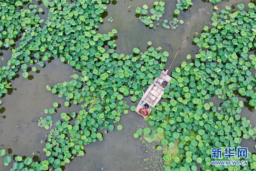 6月9日,在宿遷市宿城區(qū)中揚(yáng)鎮(zhèn)一家淺水藕套養(yǎng)小龍蝦合作社,工人在給小龍蝦喂飼料(無人機(jī)照片)。