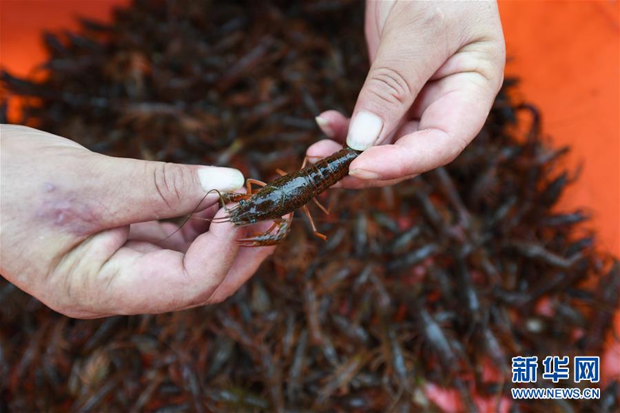 6月9日,在宿遷市宿城區(qū)中揚(yáng)鎮(zhèn)一家淺水藕套養(yǎng)小龍蝦合作社,負(fù)責(zé)人王乃國(guó)在展示蝦苗(無(wú)人機(jī)照片)。新華社記者季春鵬攝