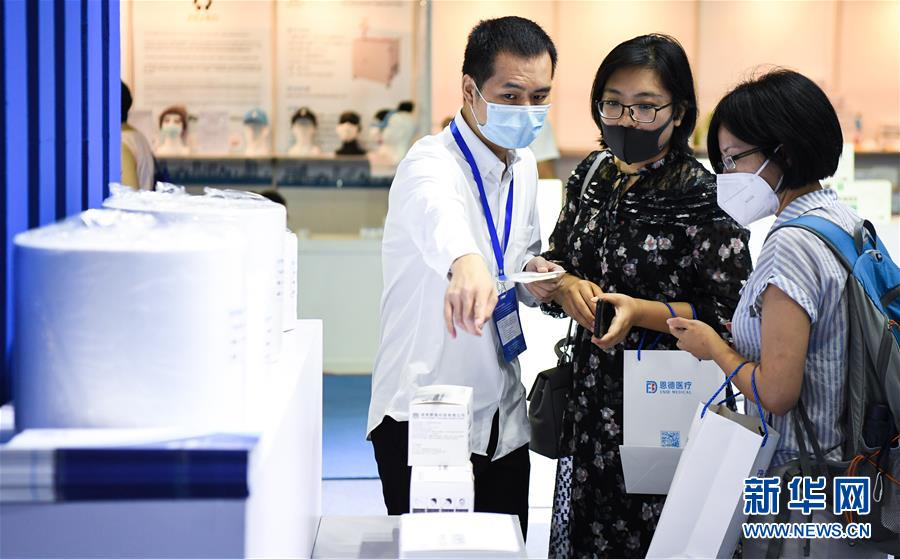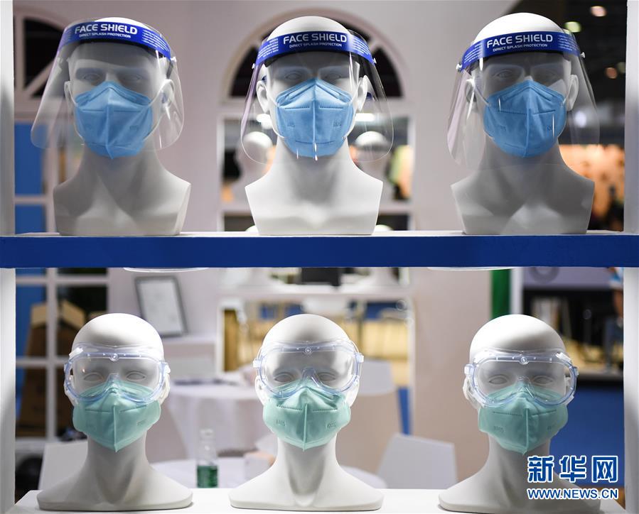 6月10日拍攝的展會上的口罩和防護(hù)罩產(chǎn)品。當(dāng)日,廣州國際防疫物資展覽會在保利世貿(mào)博覽館舉行。本次展會面積共計(jì)3.6萬平方米,設(shè)有防疫產(chǎn)品、設(shè)備、綜合服務(wù)、原輔料等4個展區(qū),參展企業(yè)約600家。新華社記者鄧華攝